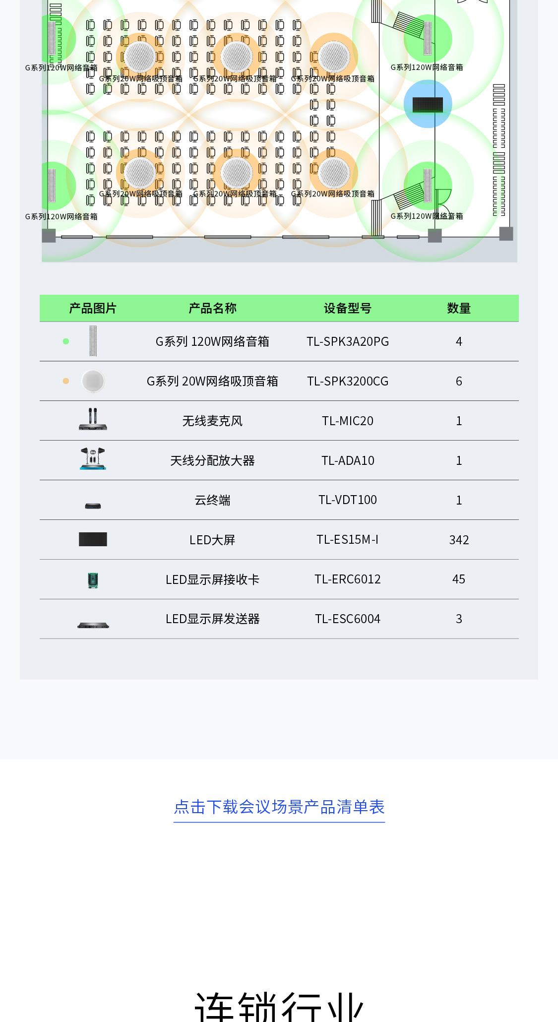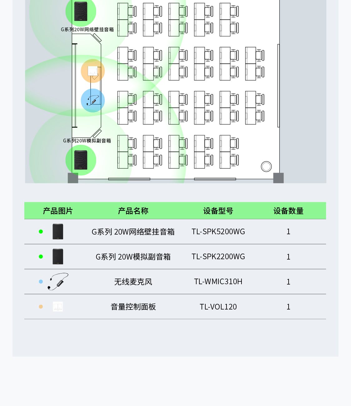 本套方案以120W高功率音柱作为主扩设备,天花板吸顶安装多台音箱作为辅助扩声设备,使得厅内各位置声音都清晰。