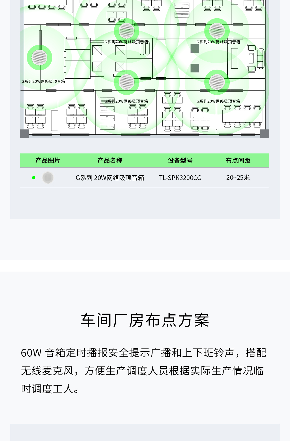 60W音箱定时播报安全提示广播和上下班铃声,搭配无线麦克风,方便生产调度人员根据实际生产情况临时调度工人。