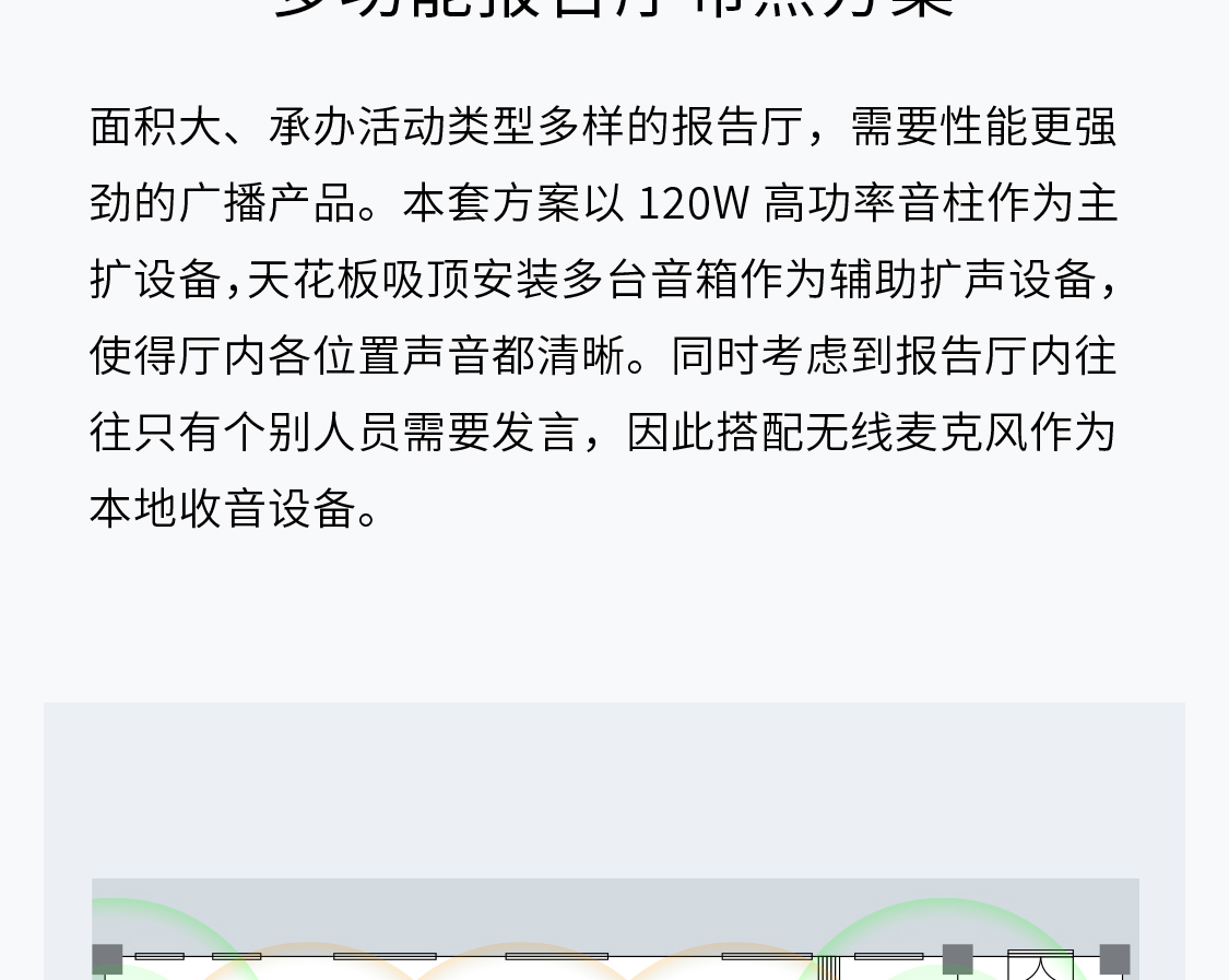 面积大、承办活动类型多样的报告厅,需要性能更强劲的广播产品。