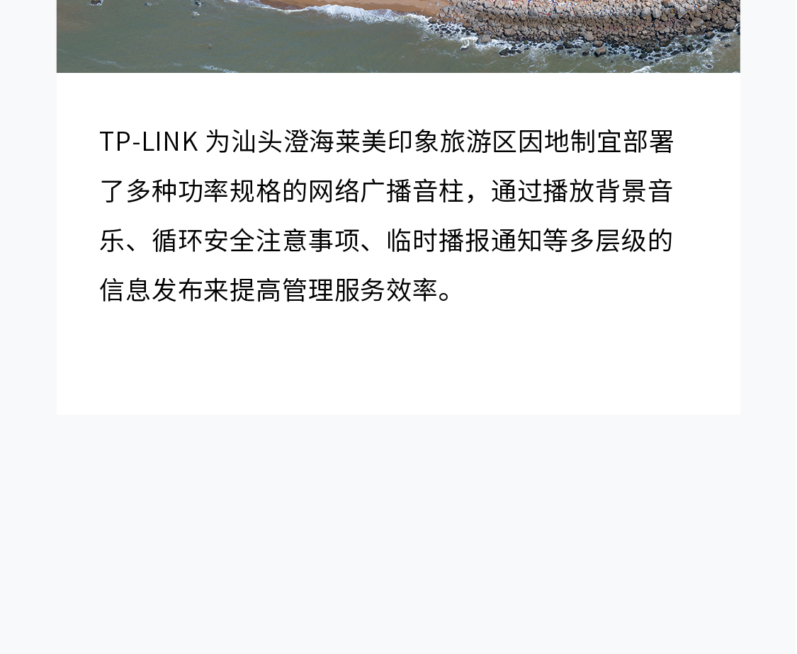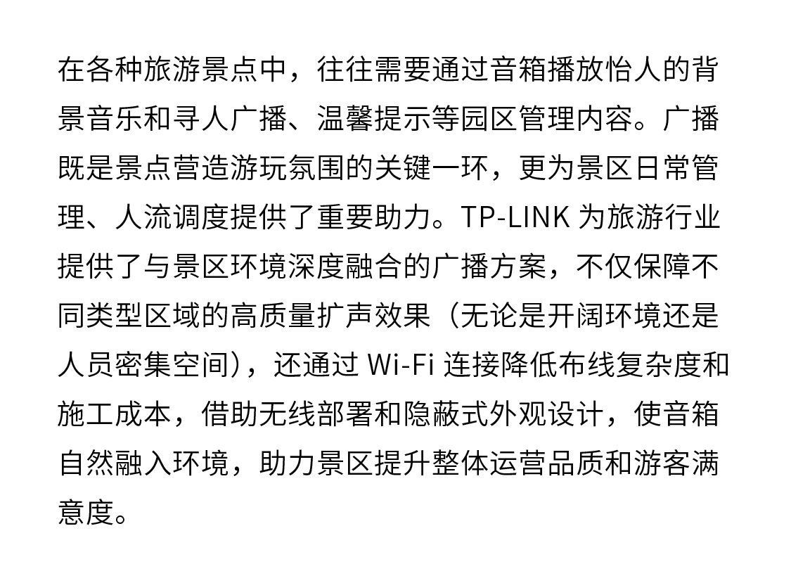 TP-LINK为旅游行业提供了与景区环境深度融合的广播方案,不仅保障不同类