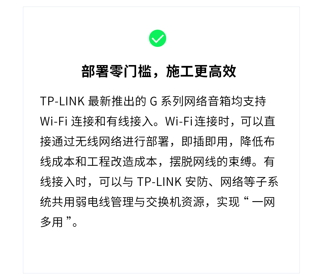 TP-LINK G系列音箱支持Wi‑Fi连接,可直接利用校园无线网完成联网部署,免除布线困扰,能实现快速、低成本的音频扩展。