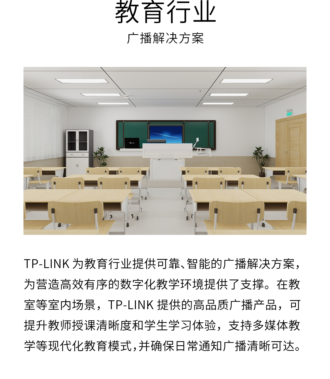 化教学环境提供了支撑。在教室行业的室内场景,TP-LINK提供的高品质广播