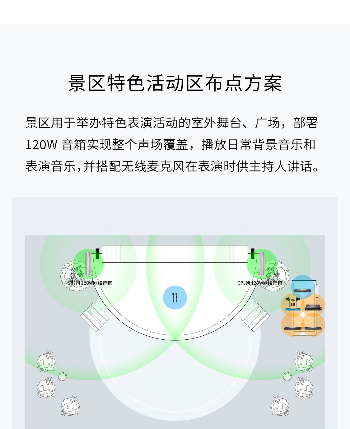 景区用于举办特色表演活动的室外舞台、广场,部署120W音箱实现整个声场覆盖,