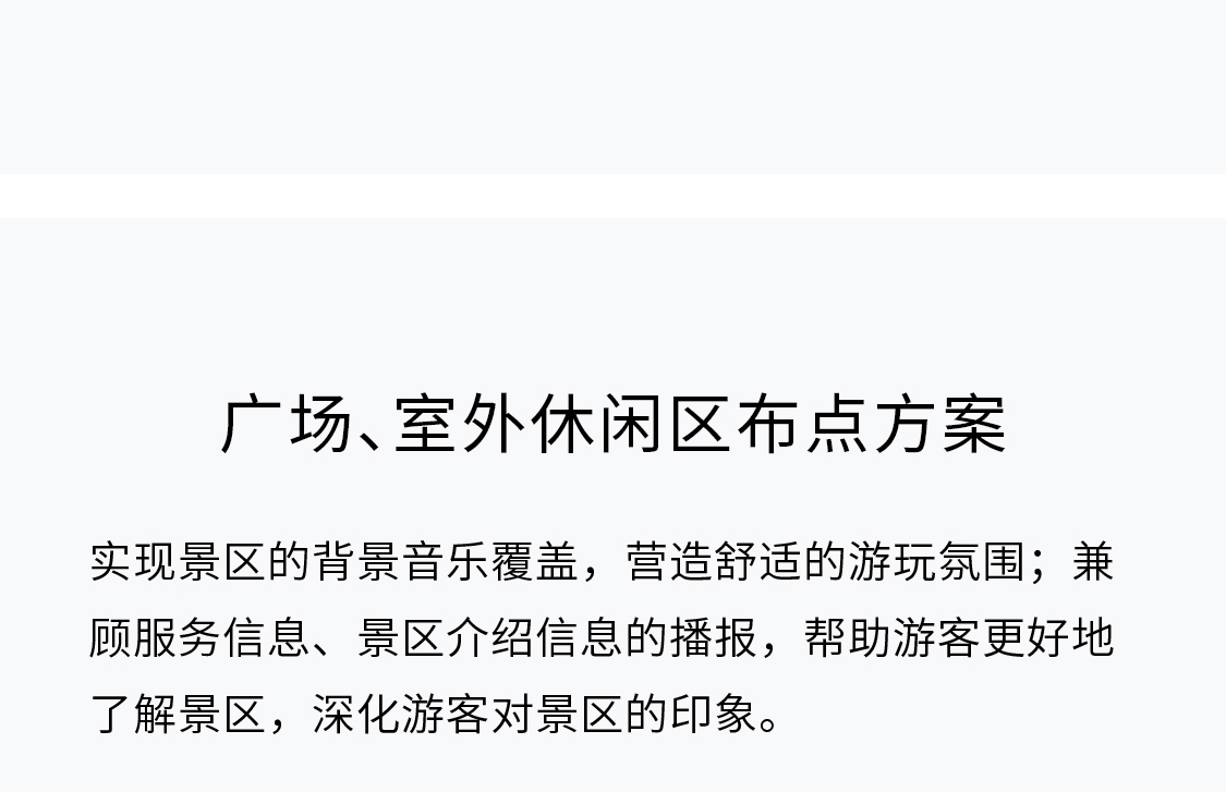 实现景区的背景音乐覆盖,营造舒适的游玩氛围;兼顾服务信息、景区介绍信息的播报,