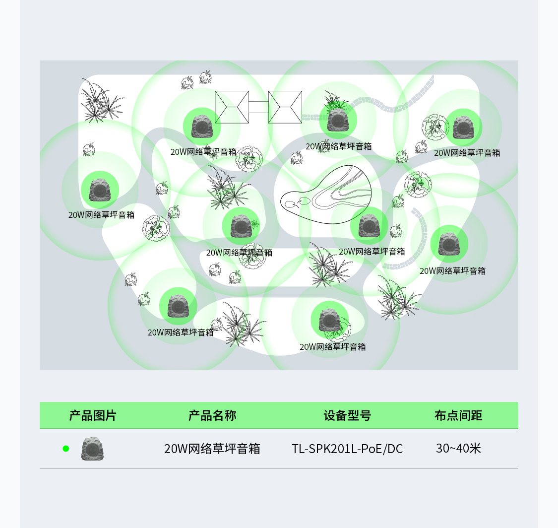 选用网络草坪音箱,播放背景音乐与安全提示的同时,保护景观的整体性与美观度,