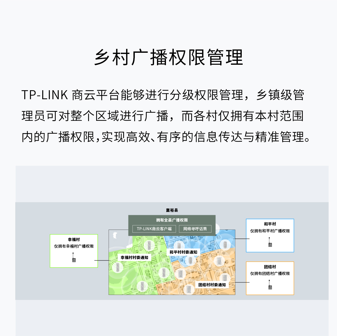 TP-LINK商云平台能够进行分级权限管理,乡镇级管理员可对整个区域进行广播,