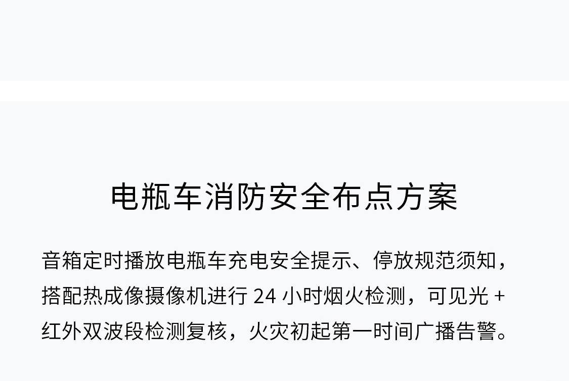 音箱定时播放电瓶车充电安全提示、停放规范须知,搭配热成像摄像机进行24小时烟火检测,