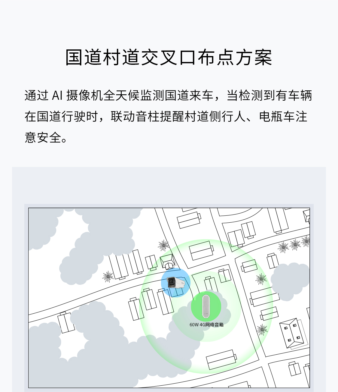 通过AI摄像机全天候监测国道来车,当检测到有车辆在国道行驶时,联动音柱提醒村道侧行人、电瓶车注意安全。