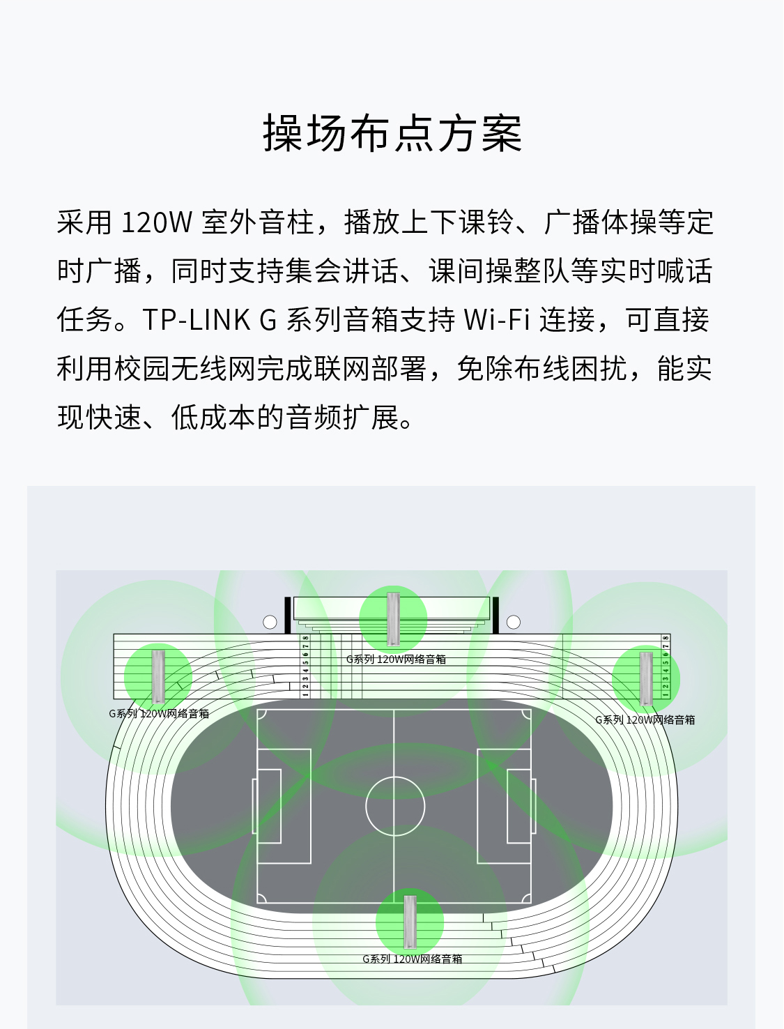 化教学环境提供了支撑。在学校操场等室外场景,TP-LINK通过科学的声场布